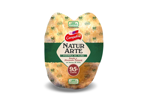 PECHUGA DE PAVO COCIDA CON ASADO Y AHUMADO NATURAL. Pechuga de pavo (95%), agua, sal, maltodextrina, estabilizantes (E-451, E-452), dextrosa, aromas, especias, extractos de especias, antioxidante (E-316), conservador (E-250) y proteína hidrolizada vegetal. Cobertura: gelatina de cerdo.