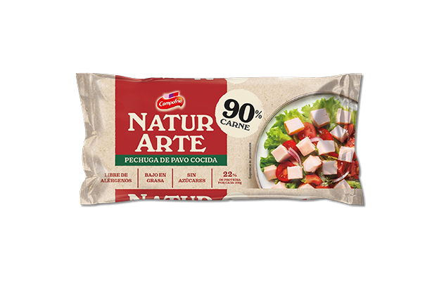 Mini de Pechuga de Pavo con un 90% de contenido cárnico. Producto muy versátil, que se puede consumir tanto frío como caliente, de forma fácil y rápida, ideal para todo tipo de recetas. Bajo en grasa y no contiene azúcares ni alérgenos.