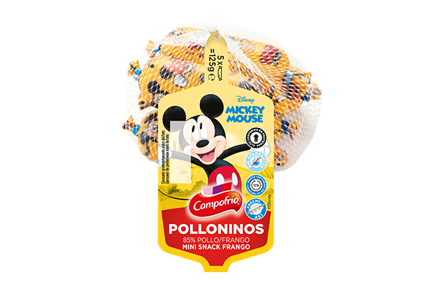 Mini snacks Disney con un 85% de Carne de pollo. Se mantiene hasta 12h fuera de la nevera. Perfectos para el almuerzo o la merienda de los más peques. Alto en proteínas y sin colorantes.